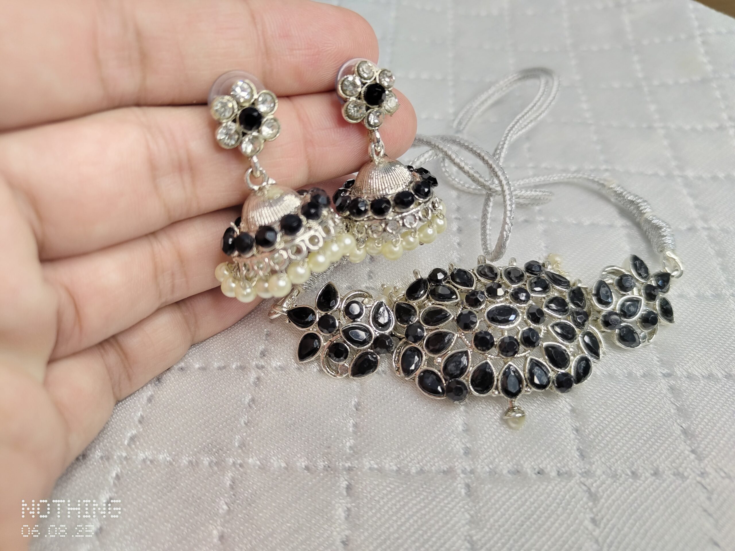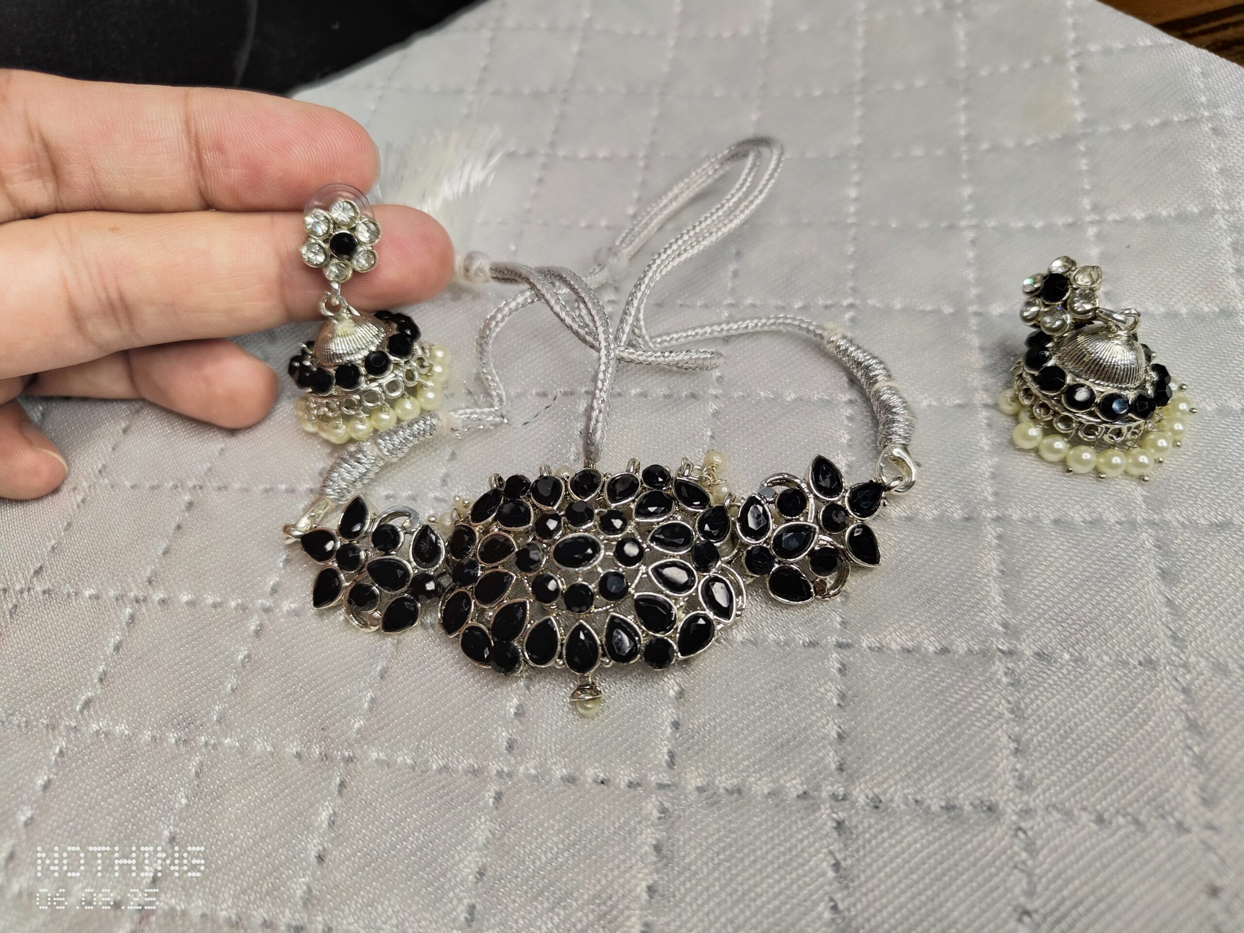 Fashion Jewellery_ Black Colour adjustable Choker Necklace with Jhumka Earring for Women and Girls.