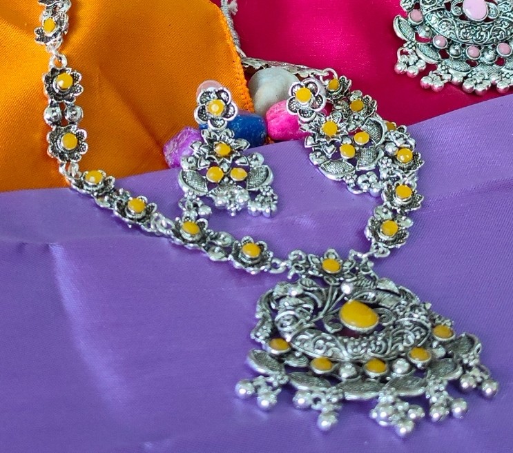 Latest Design Oxidised Long Temple Design Jewellery Necklace set with Earrings for Women and Girls.